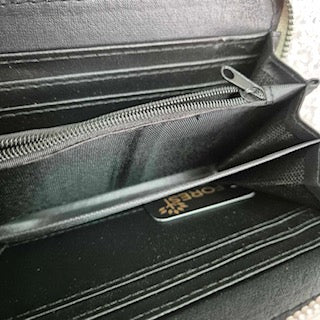 Feather purse with outside zip fastener, compartments inside for notes and a zip partition for coins